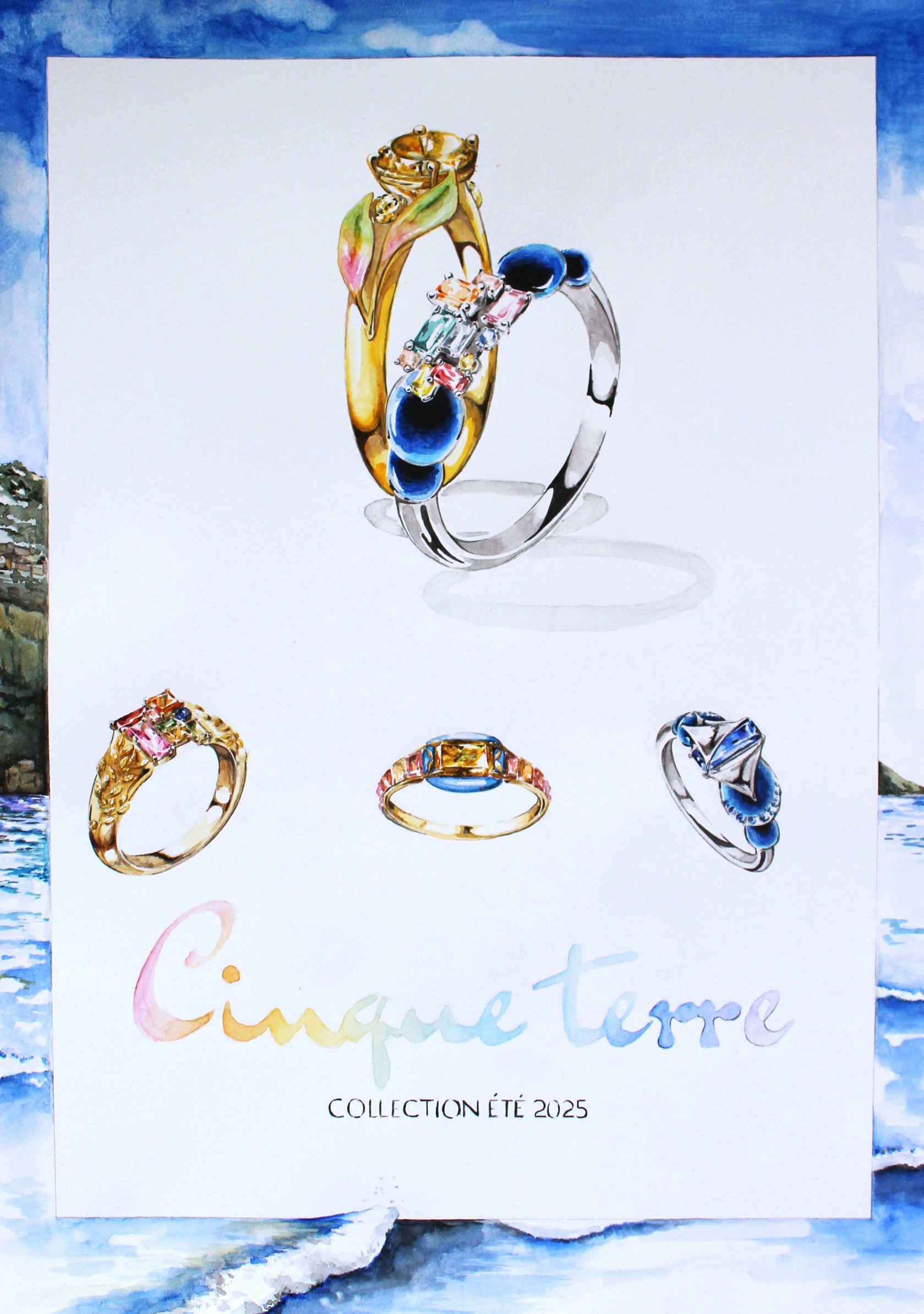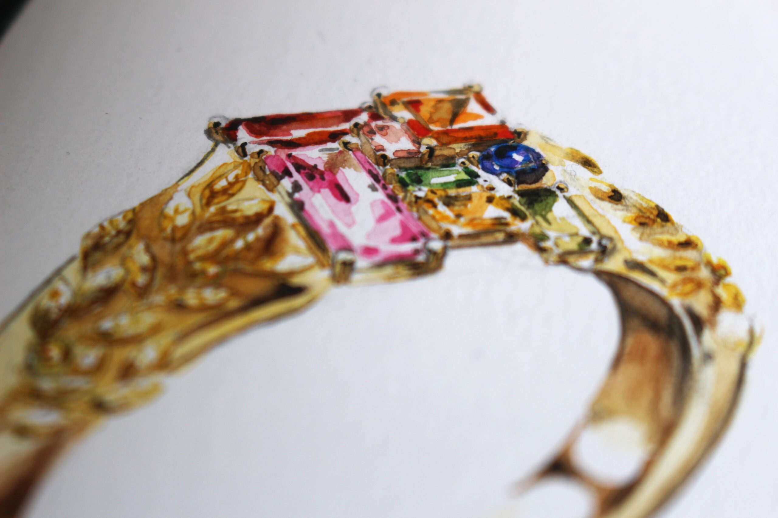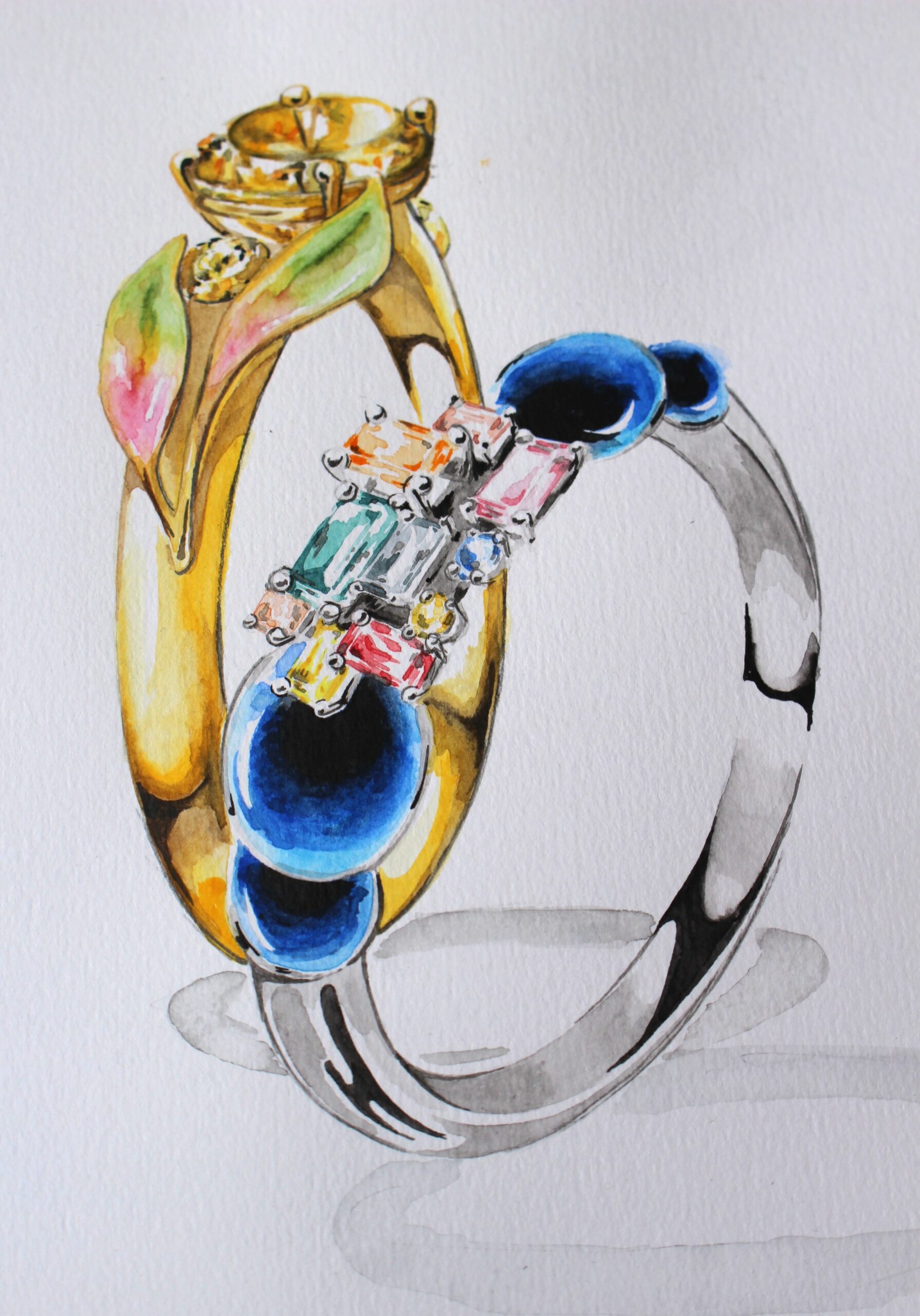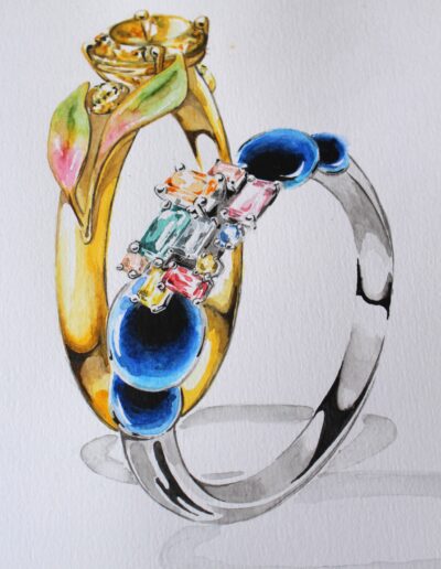 Pour embellir un site internet, mettre en valeur une collection dans un showroom, une vitrine ou un catalogue, des compositions au crayon et à l’aquarelle valorisent la recherche créative et donnent à voir l’art derrière le bijou.
